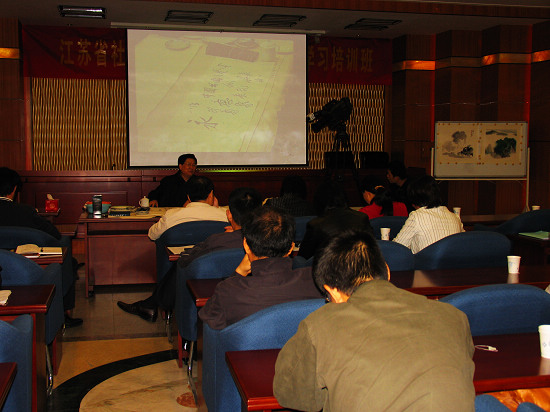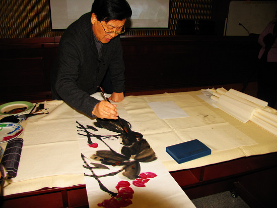 在讲座中,萧平先生主要从欣赏和鉴定的角度入手,讲解了中国书画的源与流、中国绘画的特点和江苏书画的历史与现状,带领我们进入中国绘画的瑰丽殿堂,亲身感受中国绘画的博大精深与深远意境。萧平先生还通过现场示范,讲解了中国画在处理形神关系时要求“形神兼备”,在造型和意境的表达上提倡“气韵生动”、“骨法用笔”等特点,向我们展示了中国绘画所植根于的中华民族悠久的传统文化和丰富的美学思想,让我们感受到了中国绘画独特的艺术美感和文化底蕴。讲座结束后,萧平先生还一一地解答了大家提出的各种关于书画艺术方面的提问。